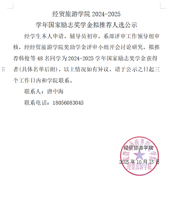 经贸旅游学院2024-2025 学年国家励志奖学金拟推荐人选公示