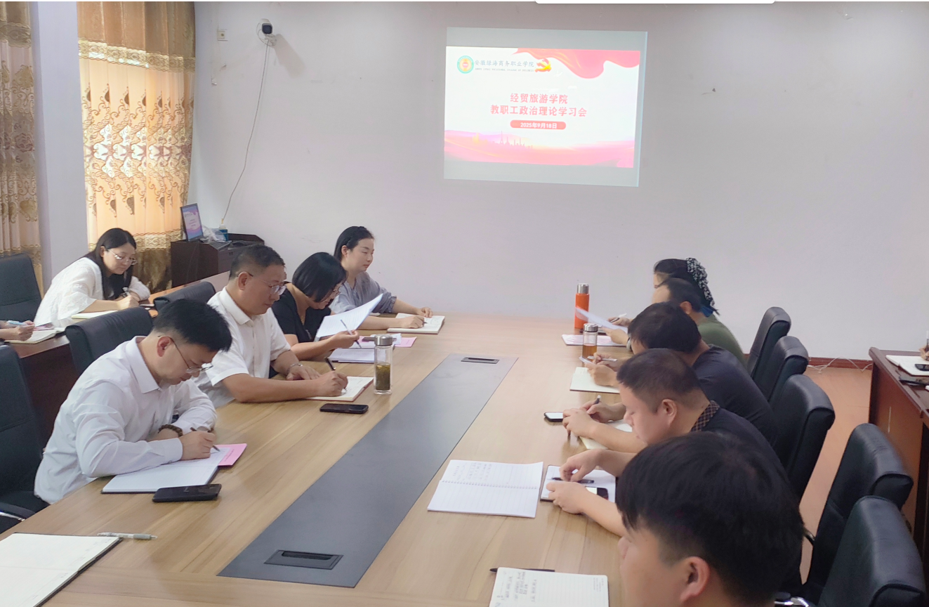 9月18日,经贸旅游学院第八次教职工政治理论学习会在行政楼208会议室如期举行。本次学习会由组织委员范贤举主持,学院党支部副书记唐中海及全体教职工参加学习。