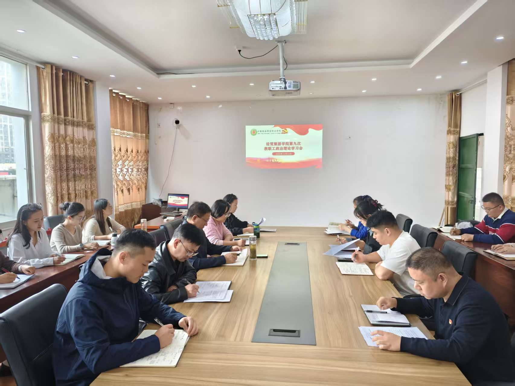 10月16日,经贸旅游学院在行政楼208会议室成功举办第九次教职工政治理论学习会。会议由党支部副书记张蒙蒙主持,党支部书记唐中海学院及全体教职工参加,现场学习氛围浓厚,充分展现了学院教师队伍高度的政治自觉和学习热情。
