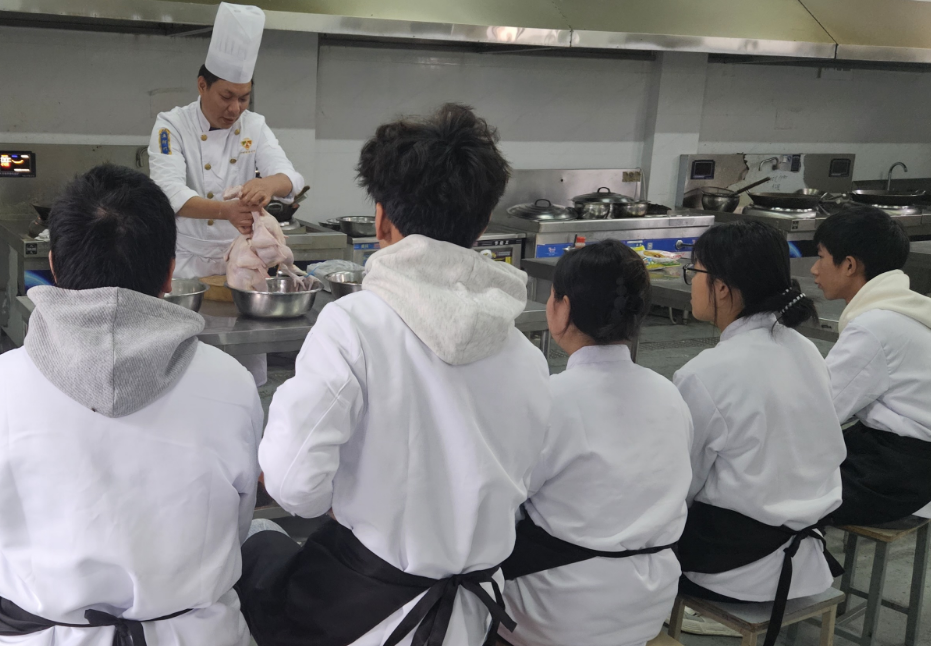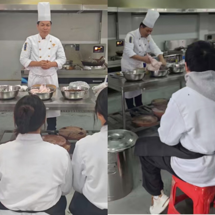 烹饪专业高永清老师带领团队提前三天开启筹备,向学生讲解“一年以上山林散养鸡”的判断标准,“这样的鸡肉纤维紧实,炖出的汤才会醇厚不柴”;对比不同产地菇类的厚度与纹路,演示温水泡发的技巧,不仅如此,老师还将营养知识融入其中,边筛选边讲解:“鸡肉的优质蛋白和香菇的多糖体是秋冬进补的黄金搭配,咱们既要做出好味道,也要懂其中的养生逻辑。”