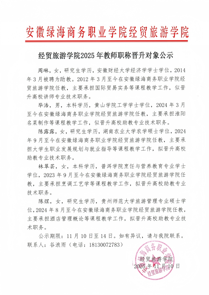 经贸旅游学院2024-2025 学年国家励志奖学金拟推荐人选公示