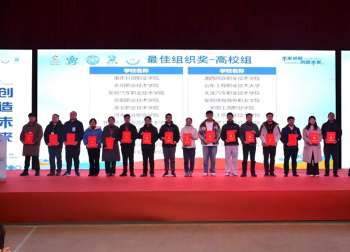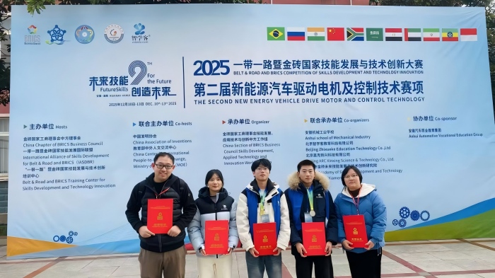 在刚刚落幕的2025“一带一路暨金砖国家技能发展与技术创新大赛”第二届新能源汽车驱动电机及控制技术赛项全国总决赛中,安徽绿海商务职业学院经贸旅游学院代表队载誉而归,在全国266支参赛队伍的激烈角逐中脱颖而出,斩获国赛一等奖1项、二等奖1项、优秀奖1项,并荣获优秀指导教师奖2项和“最佳组织奖”的殊荣!