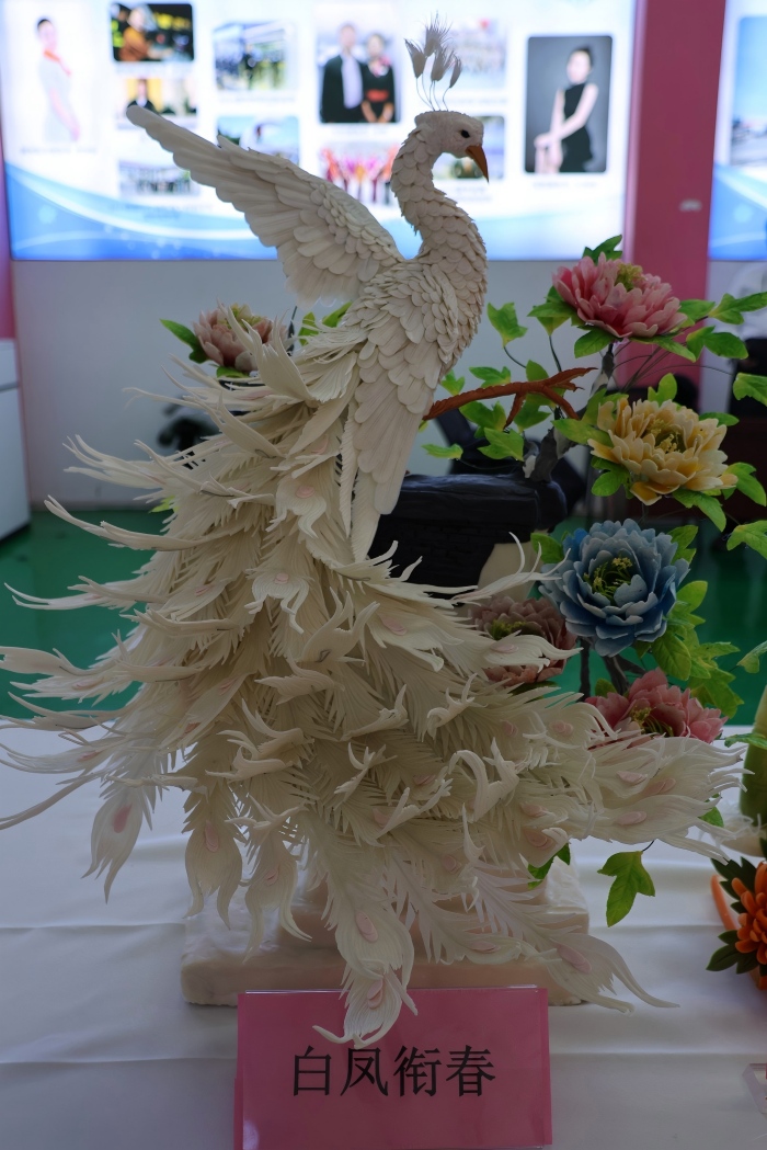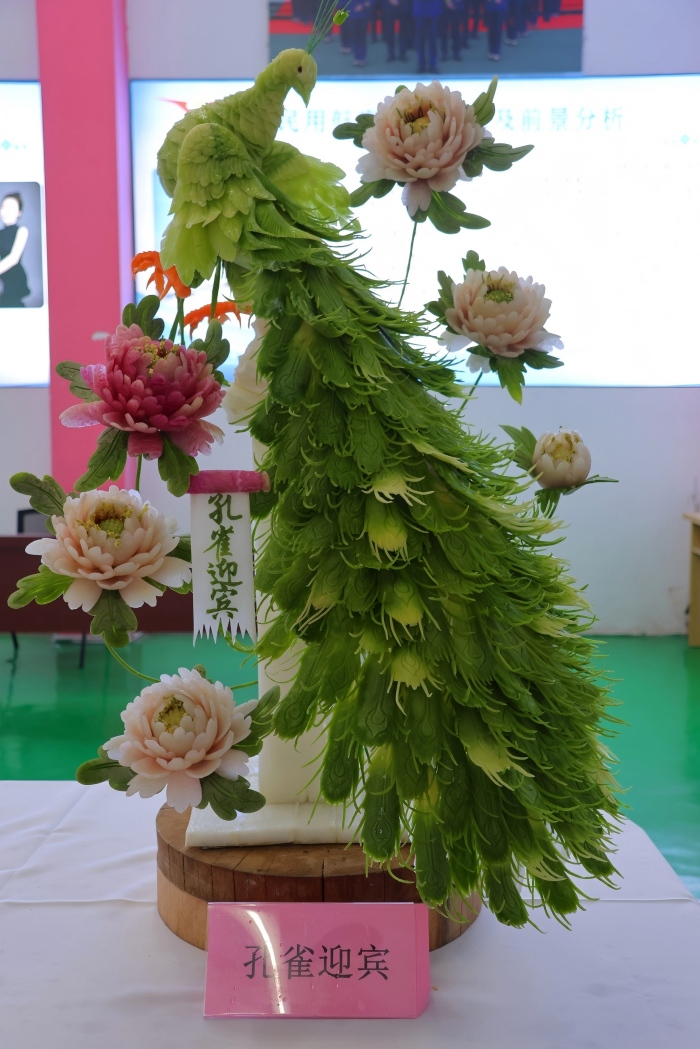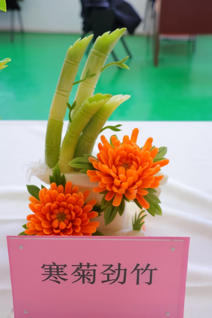 展台上,一件件作品将烹饪技艺与传统美学深度融合:《白凤衔春》以细腻刀工雕琢出羽翼层叠的白凤造型,搭配彩雕牡丹尽显灵动雅致;《孔雀迎宾》用青翠食材层叠出孔雀华羽,辅以粉白牡丹点缀,中式韵味扑面而来;《寒菊劲竹》《净瓶荷虾》等作品,则以蔬果为材,还原出劲竹的挺拔、荷虾的鲜活,细节处尽显匠心;还有色彩明艳的花形创意面点,以精巧造型与配色展现了面点技艺的多元巧思,让现场中马师生频频驻足赞叹。